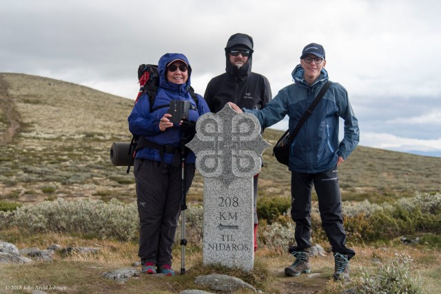 En god natts søvn og en god frokost gjør underverker. En underholdende vert og en kraftig sluttsum på oppholdet kan få hvem som helst til å gå på. Denne dagen var en kort etappe, men dog oppover og litt utfordrende at Bernt fikk hjerteflimmer og ble likbleik i ansiktet. Vi satt oss og roet oss og tok pusteøvelser som gjorde at det gikk over etter en times tid. Vi ble lettet og kjempeglad og formelig danset med små steg videre. Det store klassebildet av oss 3 skulle vi ta med selvutløser ved milesteinen som sier at det er 208 km til Nidaros. Et stilig sted. Ved enden av turen gikk vi inn på Hjerkinn fjellstue og avsluttet naturlig nok med en øl der. Lykkelige vandret vi til togstasjonen via Eysteinkirka som var stengt.