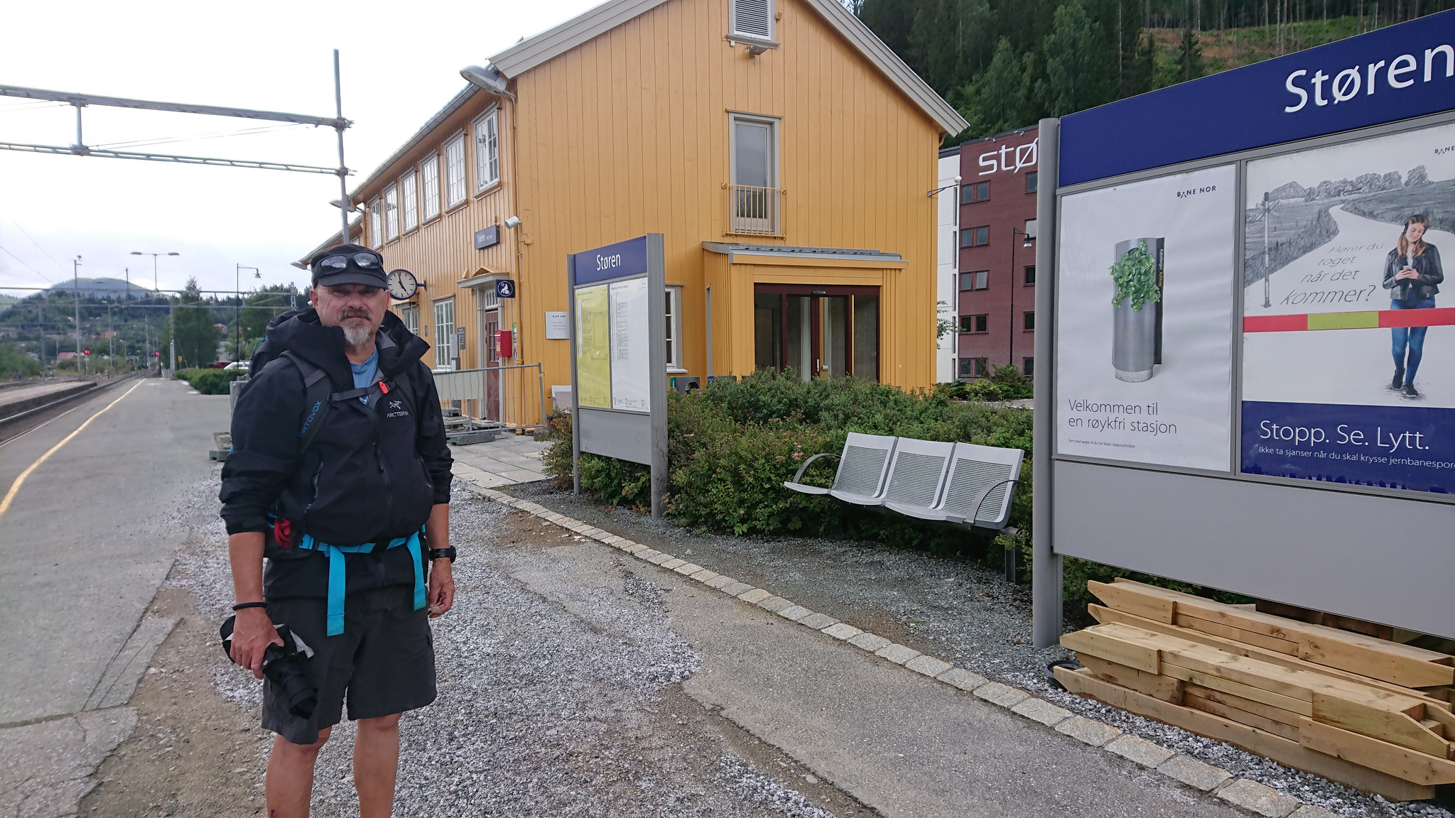 Et strekk som skulle gjøres. Ikke det mest spennende. Det var fint at Bernt var med. Vi oppdager de utroligste husklynger på de rareste steder og mye fint å se. Vi rastet utenfor Coopen på Hovin med masse ivrige veps rundt oss, så pausen ble kort før vi tok siste etappen til Støren. Av og på med ponsjo pga duskregn, er en øvelse jeg fra nå av skal bli vant med.
