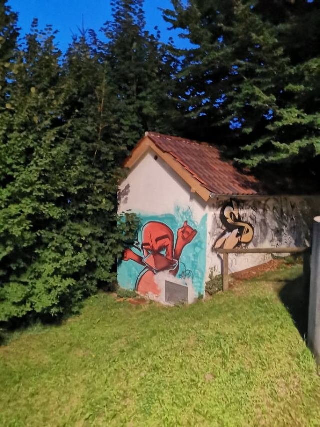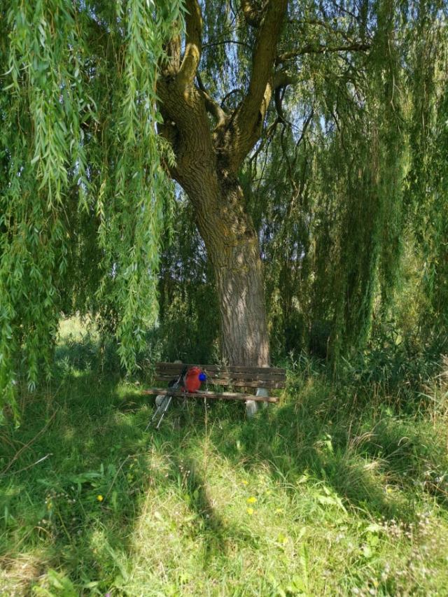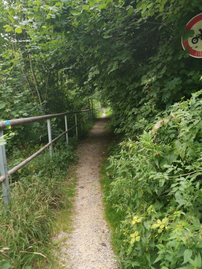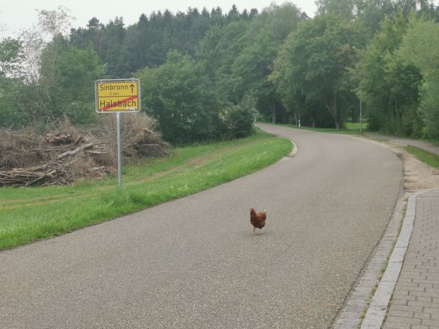 Etter 5 km stoppet jeg på en REWE-butikk og kjøpte meg en cola. Spiste maten jeg hadde tatt med fra hotellet, et smørbrød og et egg. I dag var jeg litt i form til prating og klarer faktisk å holde en samtale på et visst nivå på tysk. Været, vandringen, sivilstatus. Faktisk en fordel å ikke kunne mere tysk for da blir det med dette, fritt for følerier og politikk etc.
