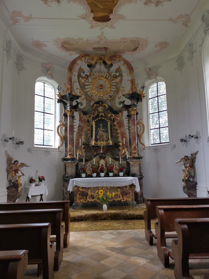 Satt utenfor et kapell, så kom en dame med nøkkel og viste meg innsiden. Virkelig vakkert. Hun snakket masse tysk og jeg skjønner det meste og kan stille noen spørsmål. Fornøyd med meg selv.
