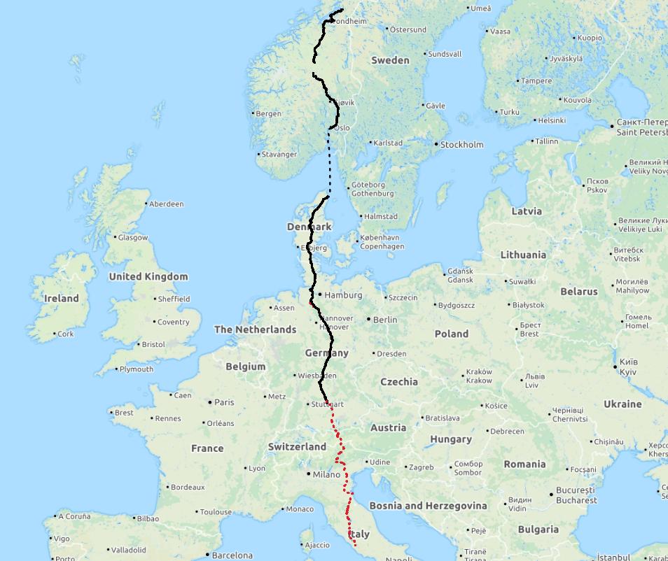 Den røde stiplede linjen er Via Romea, jeg gikk den svarte for å spare en halv mil…..Den røde stiplede linjen viser hva jeg har igjen.