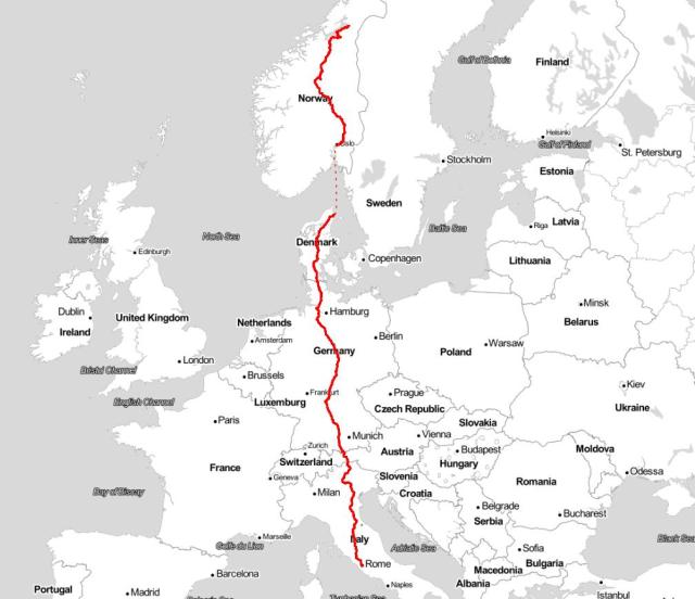 Ruten fulgte i grove trekk St-Olavsleden fra Stiklestad til Trondheim, Gudbrandsdalsleden fra Trondheim til Oslo, Hærvejen i Danmark fra Fredrikshavn til grensen mot Tyskland. Via Jutlandica fra grensen til Stade og Via Romea Germanica fra Stade til Roma. Rutene ble ikke fulgt slavisk og det ble ofte gjort egne tilpasninger, bl.a. av hensyn til overnattingssted og dagsform.