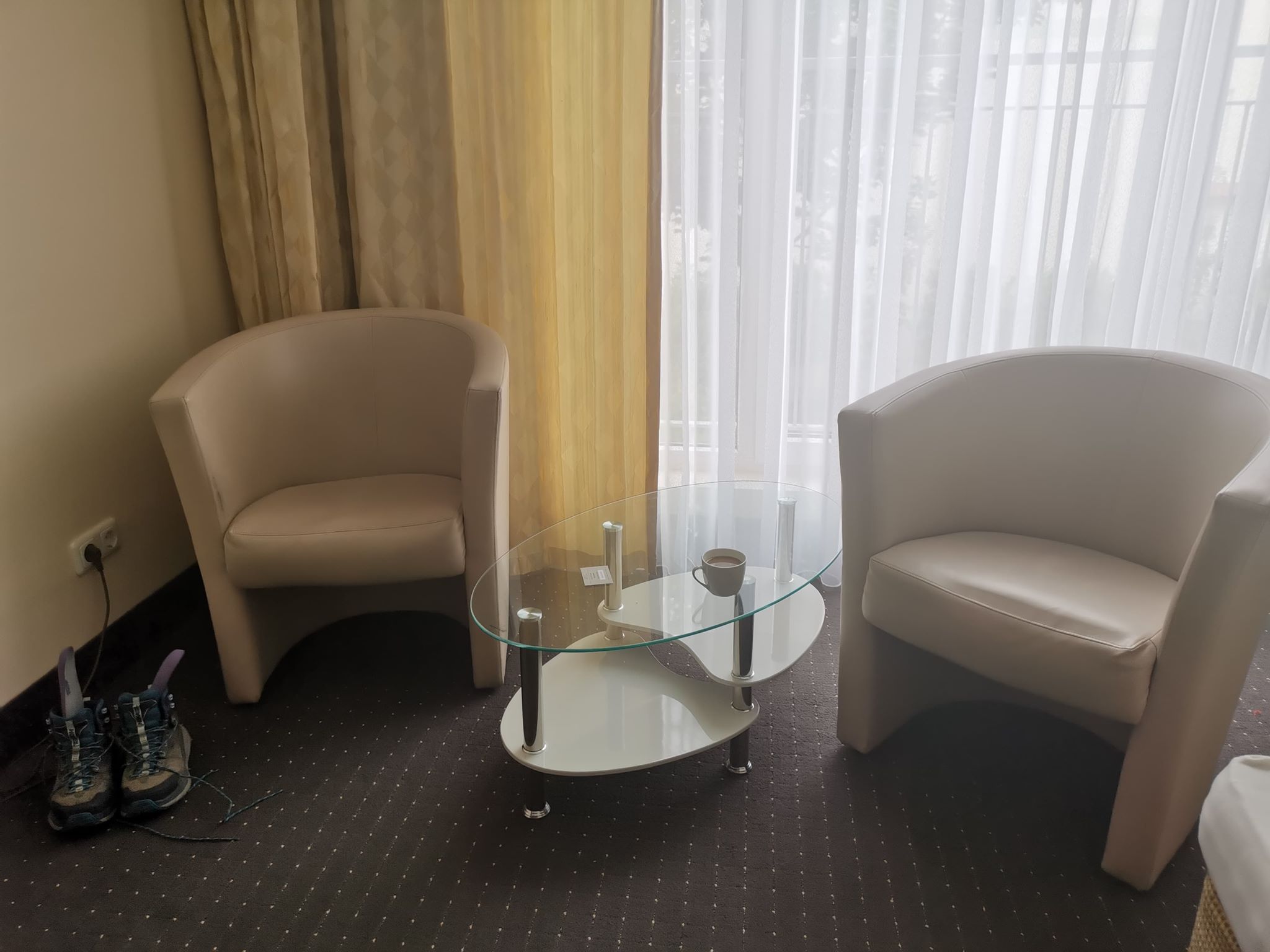 Nå bor jeg på et sånt 300 kroners her i Gotha som ser ut som en krysning av horehus, spillehall og et kloster. Det har alle aspekter og knirkete gulv. Null servering. Brødskive er bra.