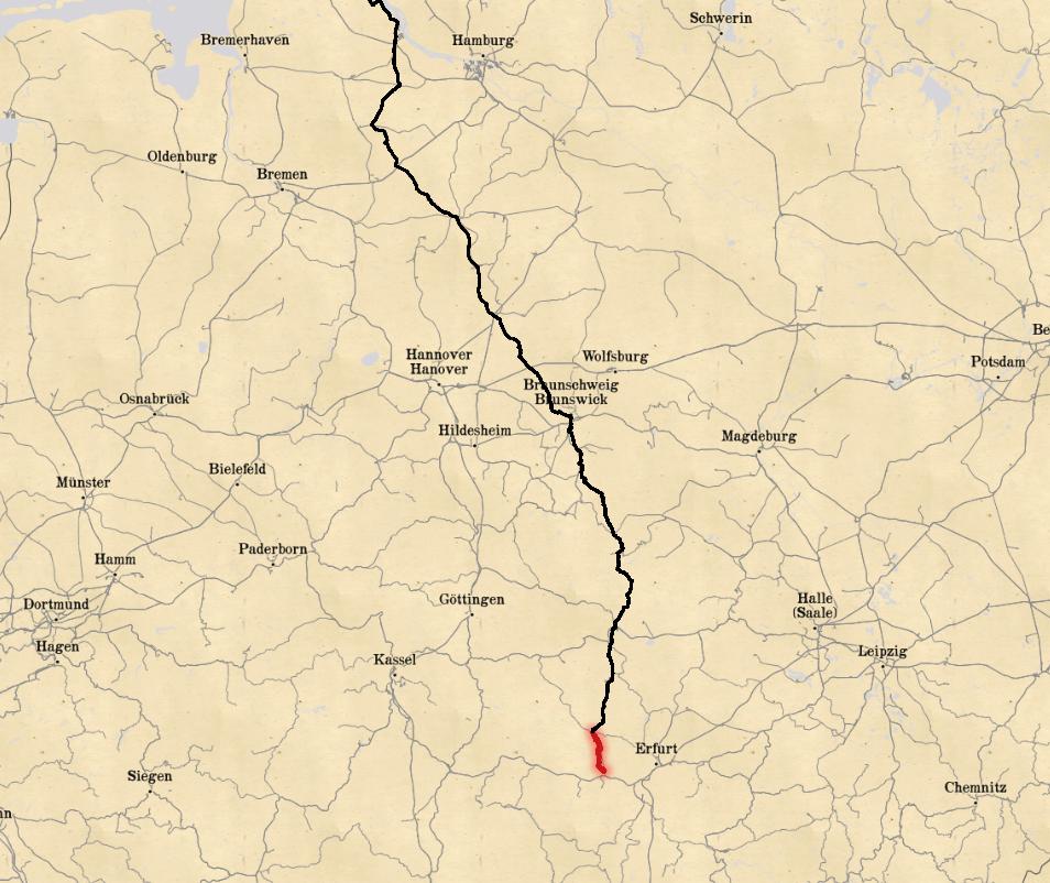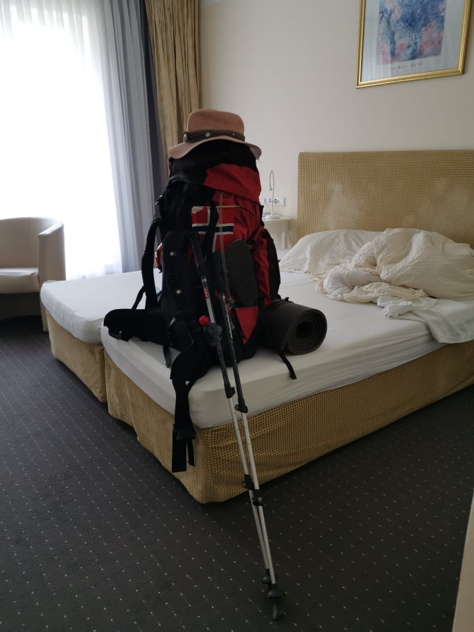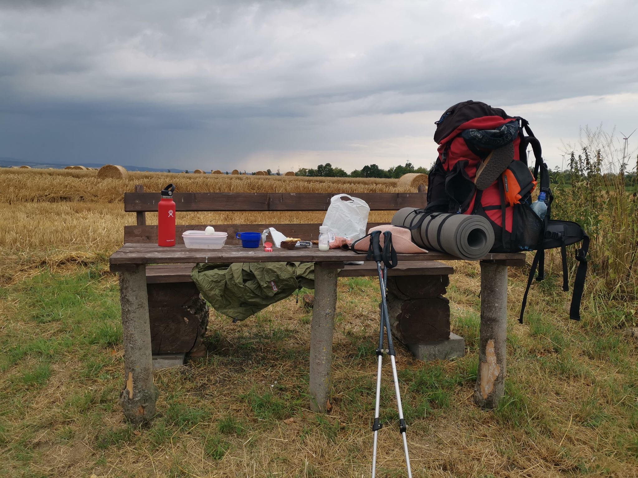 Rutiner is everything. I dag kom jeg fram ca 19:30 og da er det ikke mye tid tilbake. Spiser et smørbrød fra matpakken til middag. Det går så mye tid til å gå ut. Jeg skal legge meg før 22:00 og opp kl 06:00. Har en by i sikte. Bad Langensalza. Har gått 7 dager på rad, så jeg bremser for å sikre at jeg ikke går på en smell. Hviledagen er proppet til randen av drømmer. Svømme i et offentlig bad, få vasket klærne på vaskeri (og ikke bare håndvask). Frisør og sitte på en fortausrestaurant med et glass hvitvin. Så får vi se hvilke av drømmene som blir sånne.