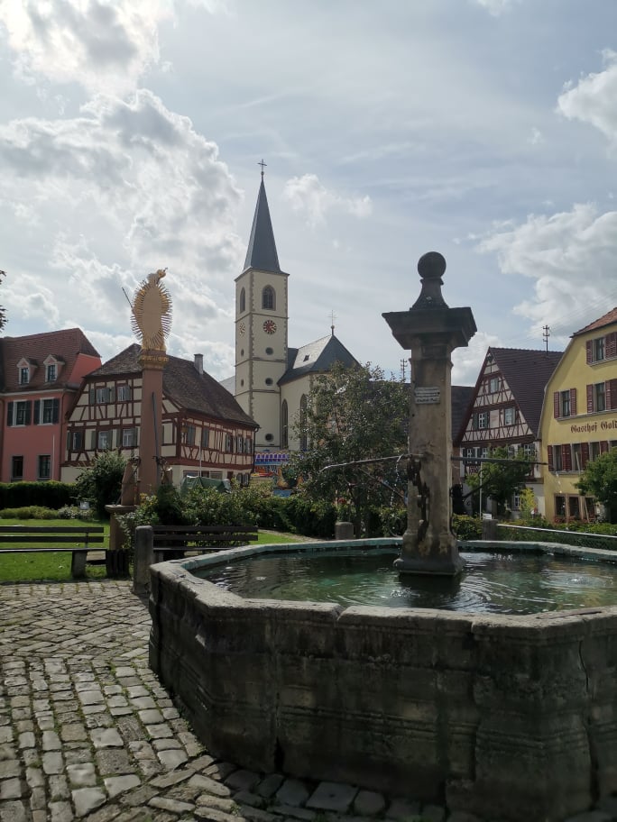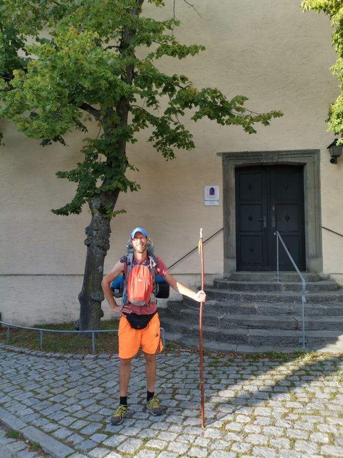 Taxien hentet meg kl 10 og kjørte meg tilbake til der jeg slapp trackingen i går, i Donauwörth. Gikk 100 meter og rett inn i en katolsk kirke og tente et lys for John Arvid som har begynt på folkehøgskole i går. Jeg har vært så spent. Skulle ønske jeg var der og kjørte han dir, men faren har gjort en utmerket jobb. Nok kjærlighet så blir det bra og trygge sønner. Han virker som han mollkoser seg, selv om vemodet tok han litt i går. Vanskelig å gi slipp på ‘det som var’. Derfor folk blir sittende hjemme, jobbe seg i hjel eller spise seg usunne eller løpe for livet, eller drikke for å døyve osv osv. Det er lett å la det være å utfordre seg selv, for det smerter å vokse.