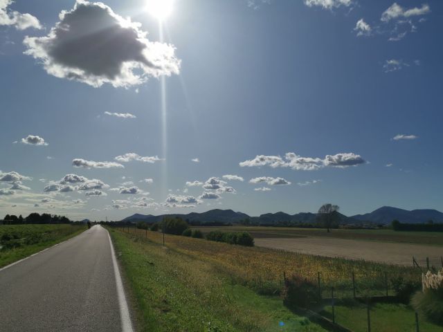 Tuslet avgår, godt humør, ante fred og ingen fare, en sværing av en kar stoppet på sykkel og spurte om jeg visste om elven og Via Romea. Han snakket bare italiensk og jeg svarte på engelsk. Han skulle visst alt jeg visste om kart for tiden og at jeg visste godt hva jeg hadde valgt bort i dag, til fordel for 3 netter på samme plass, men jeg sa ikke noe. Lot han bare snakke. Det er rart hvor mye folk vet om å vandre i 5 måneder, uten å noen gang ha gjort det.