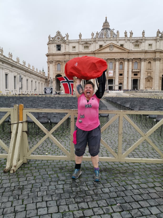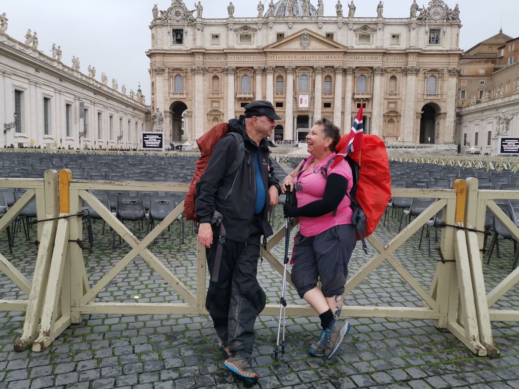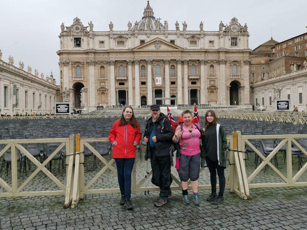 Siste dagsmarsj inn til Vatikanet i Roma og Petersplassen foran Peterskirken. Fin sykkel-og gangvei fram til Monte Ciocci, tror vi så ut som pilegrimer siden mange smilte og hilste vennlig på oss. Ved Valle Aurelia møtte vi Vilde og Ruben som gikk de siste par kilometrene sammen med oss. Fra Valle Aurelia gikk vi gjennom travle gater, og rundet til slutt inn på Piazza Pio XII og inn på Petersplassen (Forum Sancti Petri).